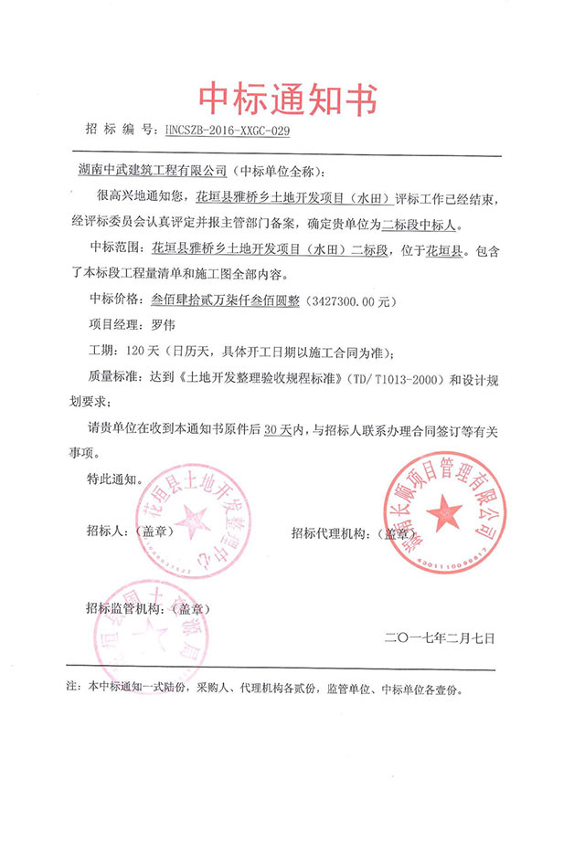 花垣县雅桥乡土地开发项目(水田)项目中标通知书